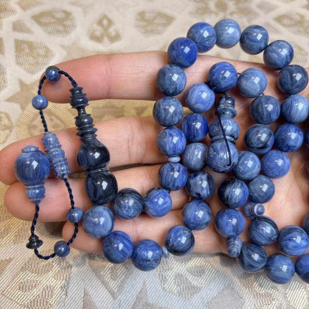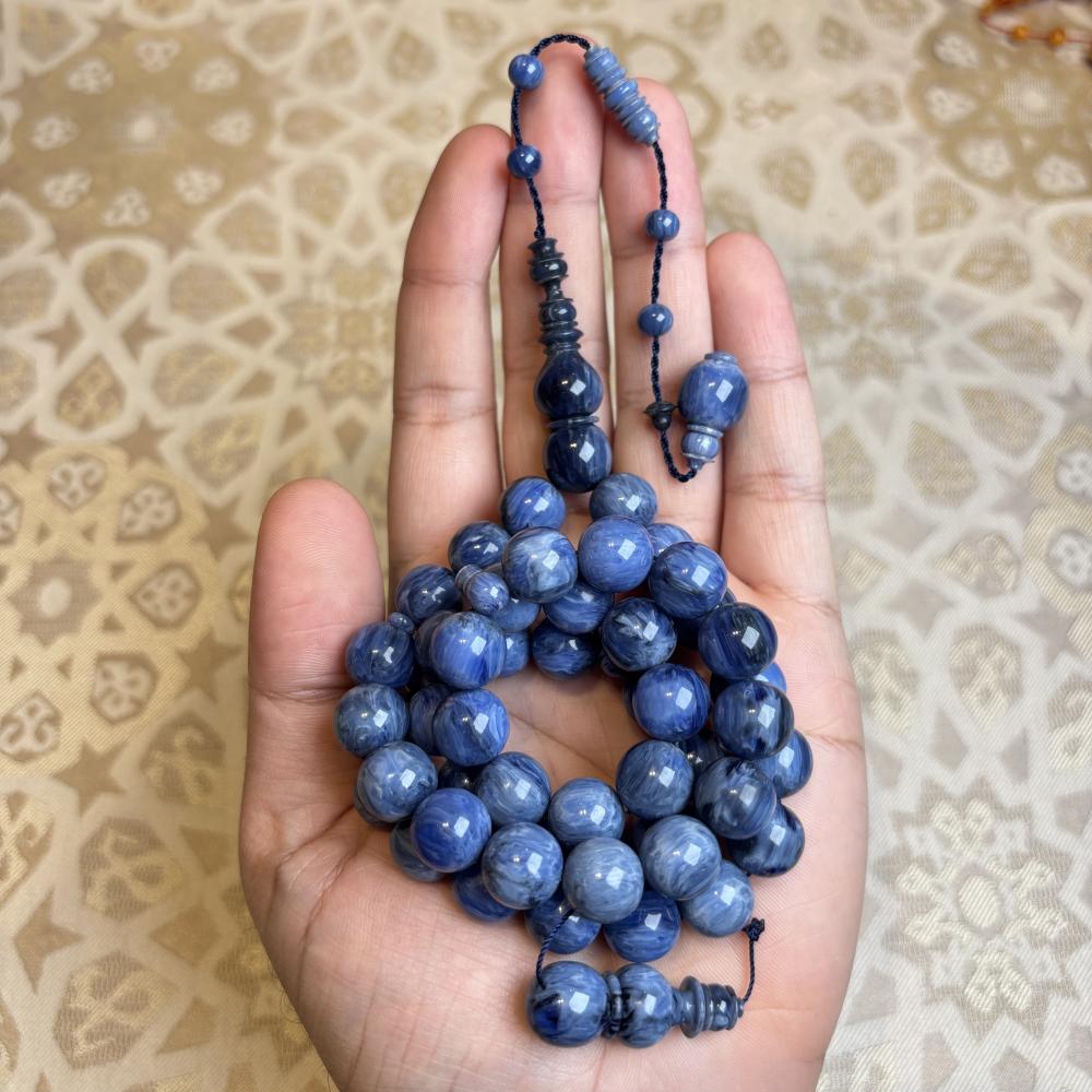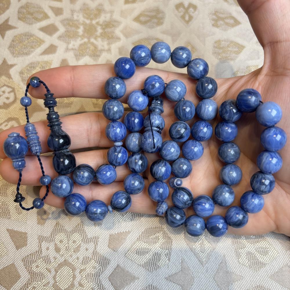 تتكوّن من 49 خرزة كروية بحجم 12×11.5 ملم مصقولة بعناية لتبرز اللمعة الغنية المميزة لخامة الفاتوران، وتمنح المسباح حضورًا متوازنًا في اليد ولمسة راقية تليق بالذوق الرفيع.