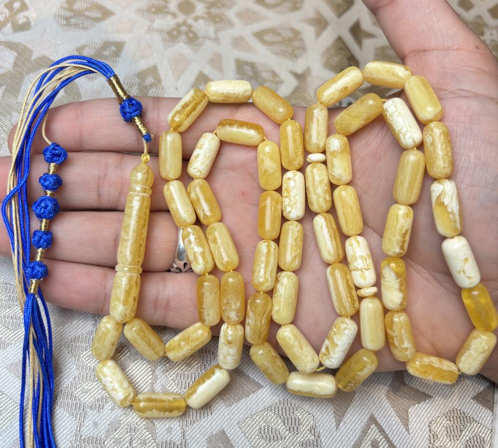 تتكوّن من 55 خرزة بحجم 16.9×7.7 ملم، مصقولة بعناية لتُبرز لمعان الكهرمان وتموّجاته الفريدة.