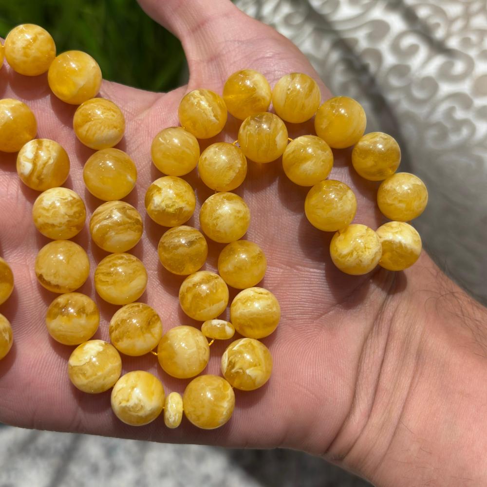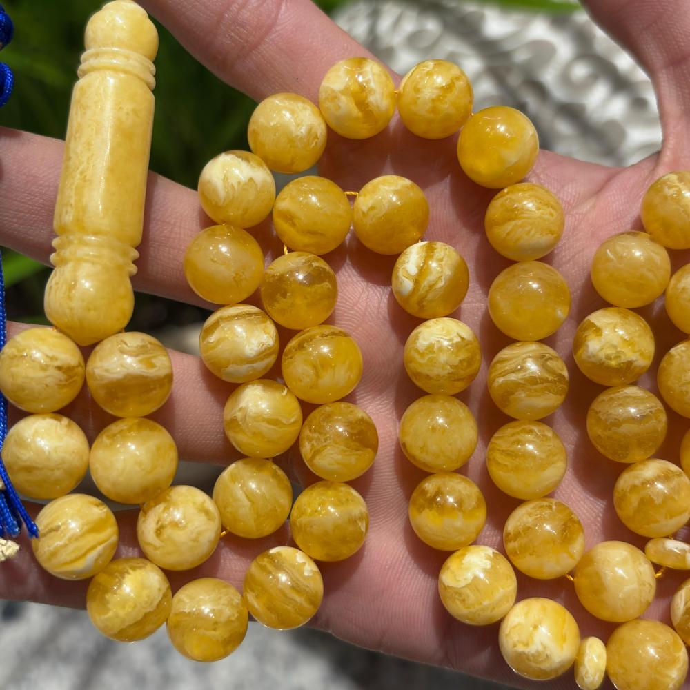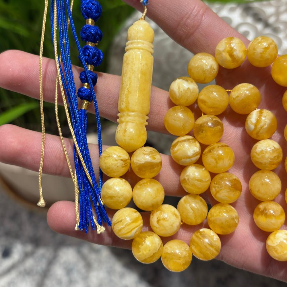 مسباح "الشيوخ" المصنوع من الكهرمان المُسال بتصميم كروي فريد، يجمع بين الرقي والانسيابية في كل تفصيلة.