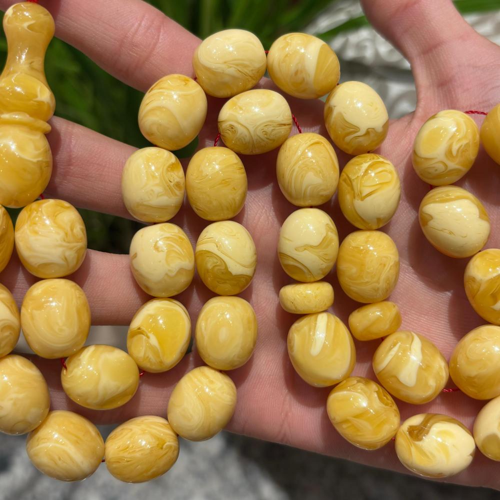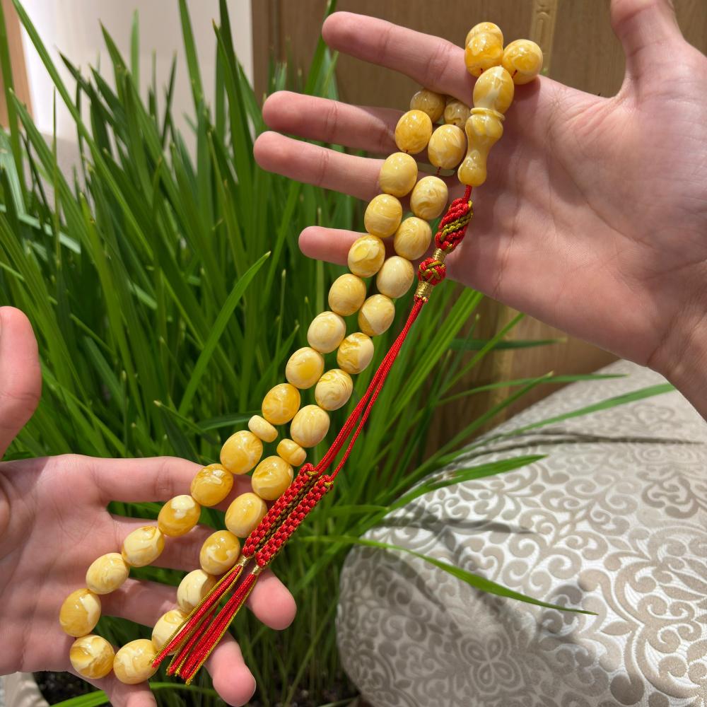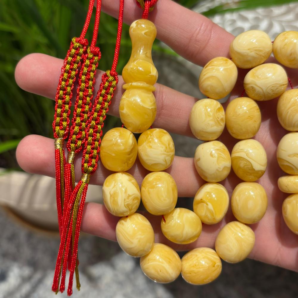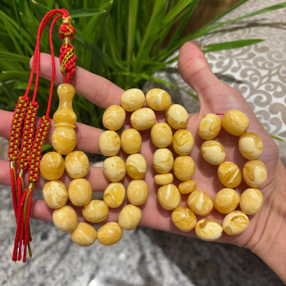 الكهرمان الصافي المسال يتميز بملمسه الدافئ ووزنه المثالي، ويُفضل من قبل المهتمين بالمسابح الفاخرة ذات القيمة العالية.