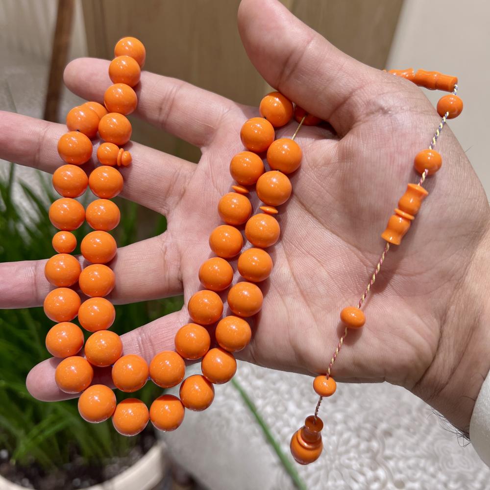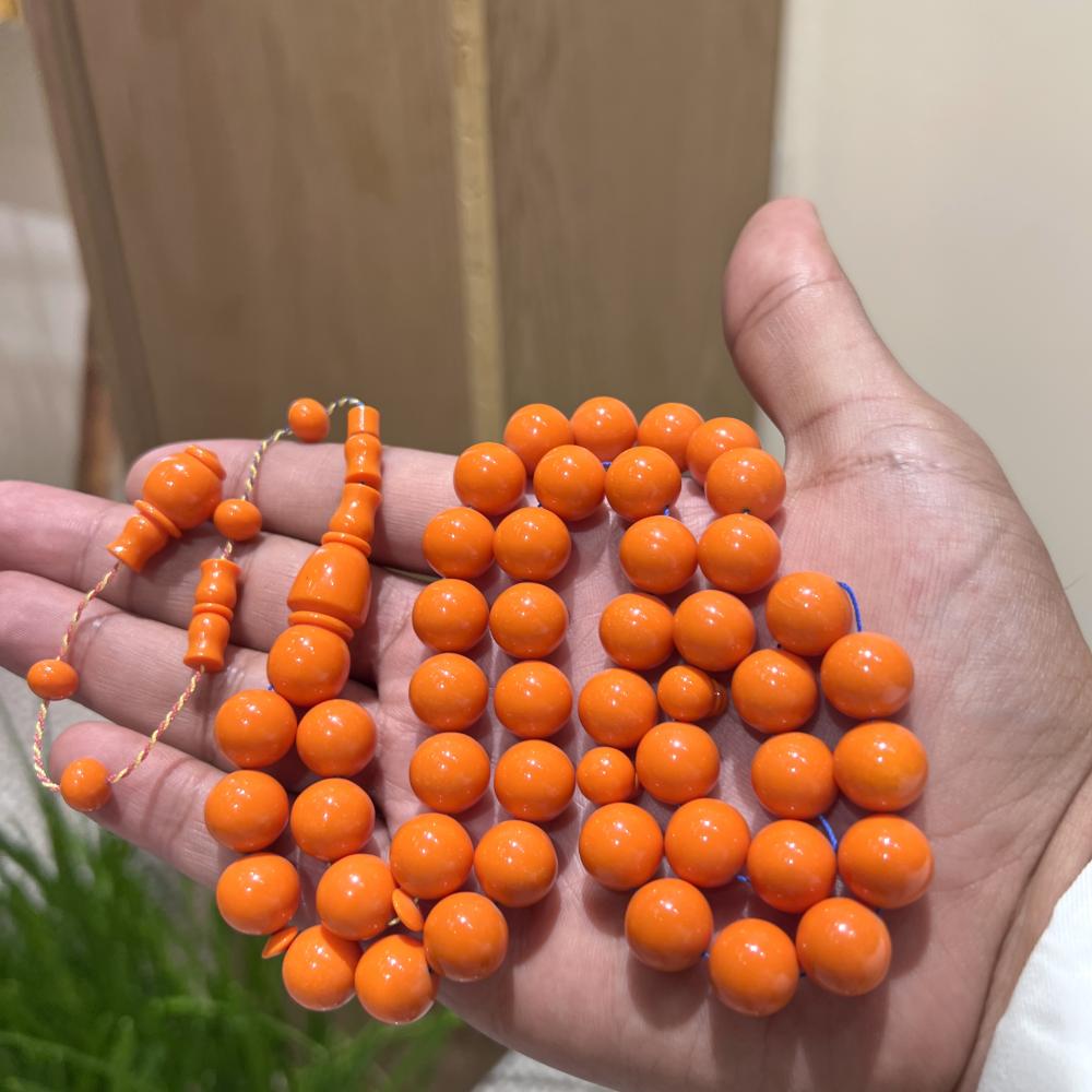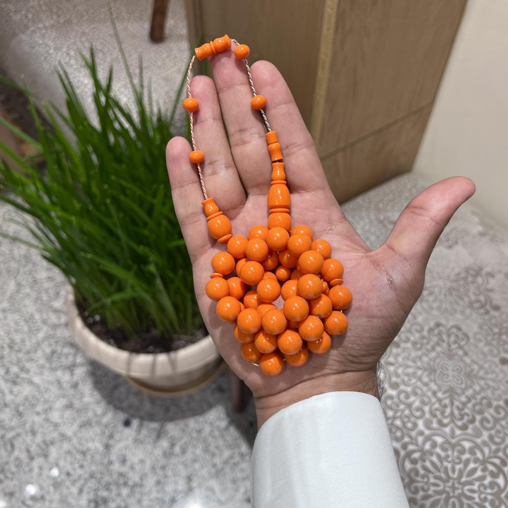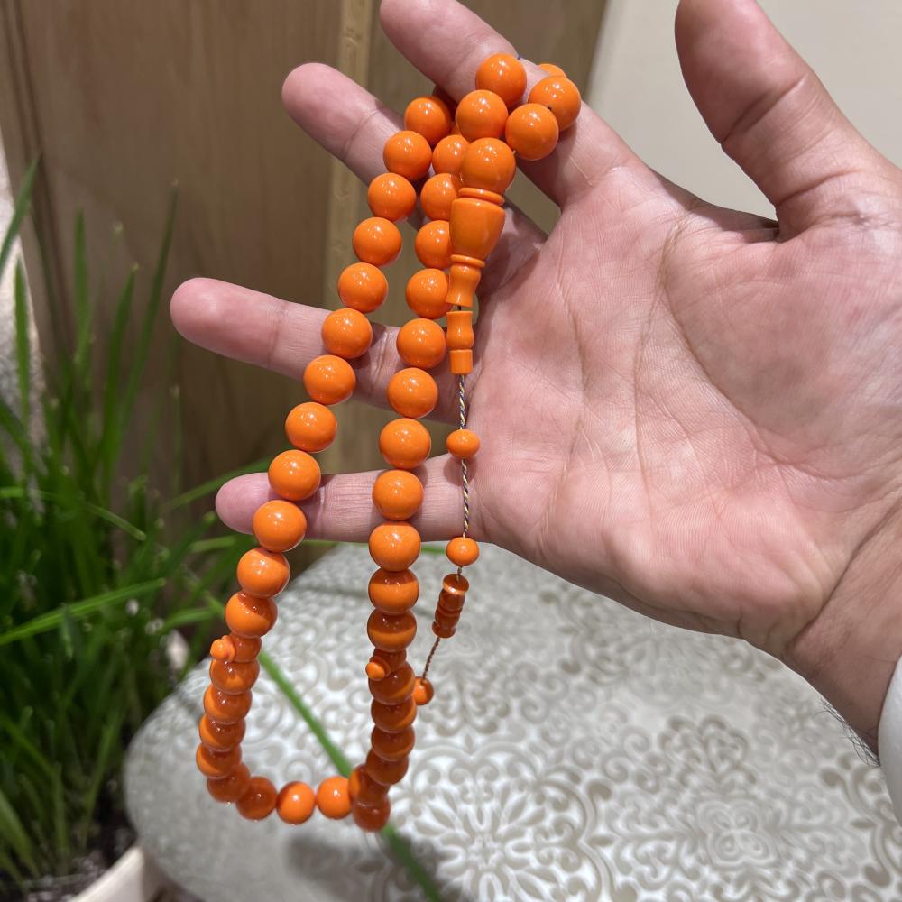 مسباح “الشيوخ” المصنوع من كرة البولينق بلونه البرتغالي الجزري اللافت، يجمع بين القوة واللمعة المميزة في كل خرزة.